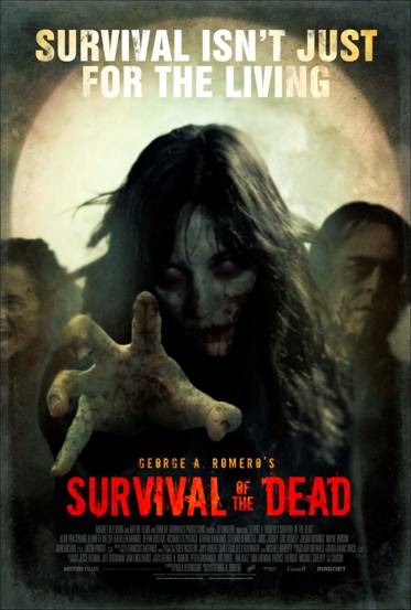 "Survival isn't just for the living is the sweet tagline for Survival of the Dead, George A. Romero's latest zombie flick premiering on VOD, XBOX Live, Playstation and Amazon on April 30th before taking over theaters on May 28 from Magnet Releasing. Gearing up for the release, beyond the break you'll find our exclusive look at official one sheet! The plot involves inhabitants of an isolated island off the North American coast who find their relatives rising from the dead to eat their kin. The leaders of the island feud over whether or not to kill their reanimated relatives or preserve them in hopes of finding a cure.